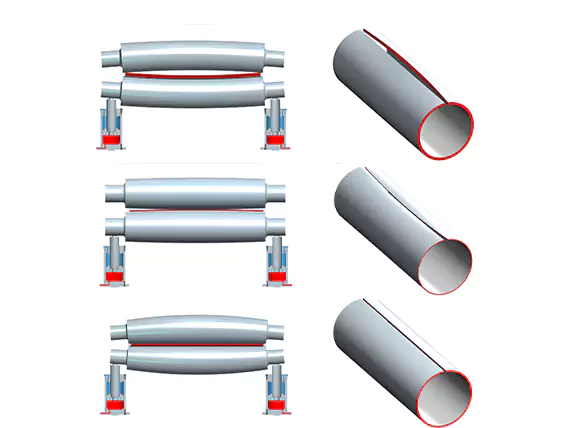 Durante o processo de flexão, A pressão aplicada aos rolos pode causar uma leve deflexão no centro, levando a curvaturas irregulares ou zonas planas ao longo da placa. Para eliminar isso, Nossas máquinas estão equipadas com um Sistema de compensação de coroação com engenharia de precisão.